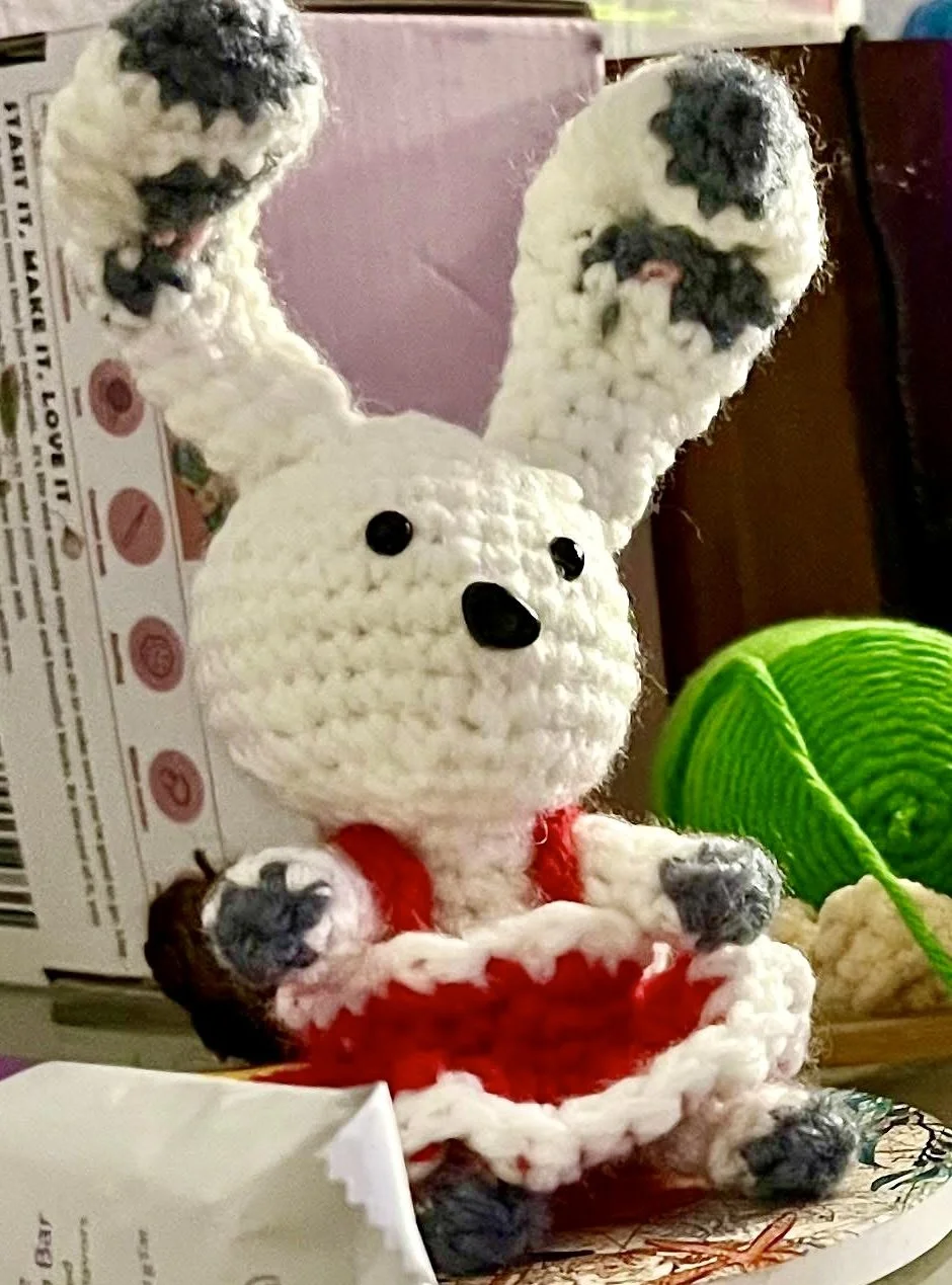 Little bunny is white with touches of gray on the ears and paws. She comes with the dress and is modifiable: colors and dress.